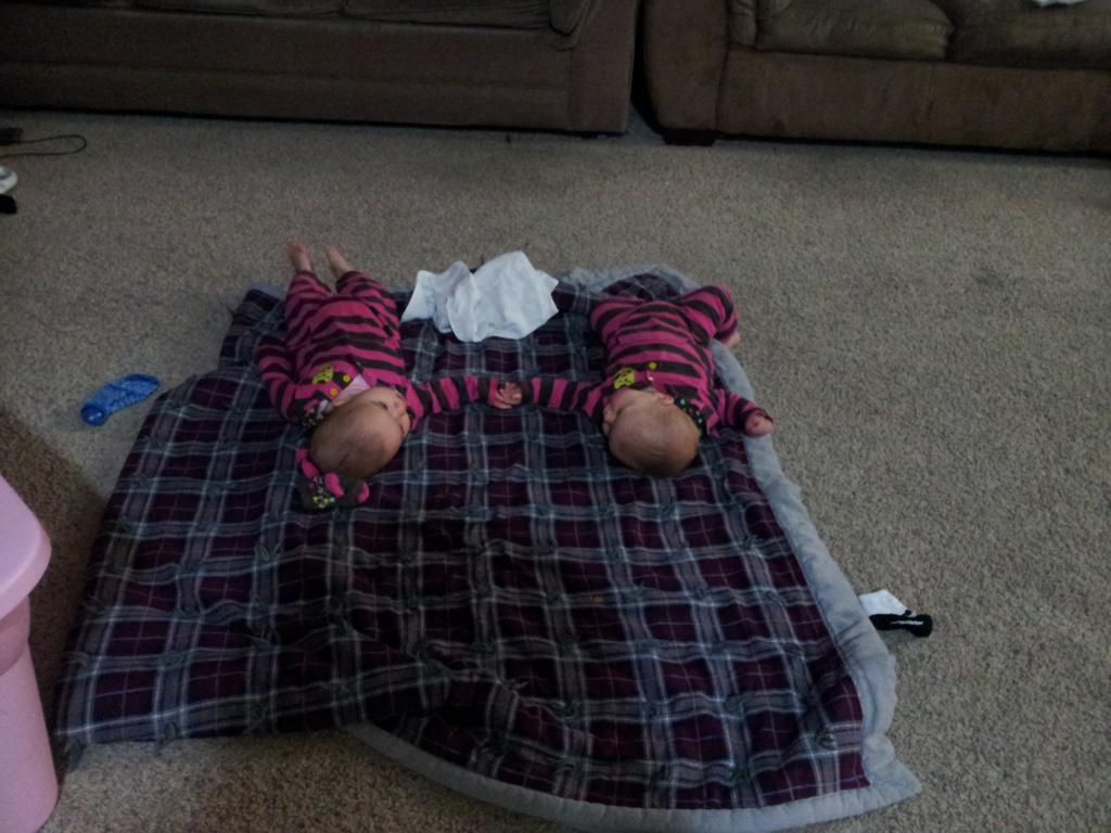 One of the many crazy poses we find the babies in. Jane doesn't move around much so she's the one stuck face down on the ground. Kate rolls around like crazy and is usually the one doing the weird and crazy things.